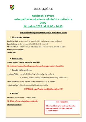 Oznamujeme, že svoz nebezpečného odpadu proběhne v úterý 14. dubna 2026 od 14:00 do 14:15, a to před budovou Obecního úřadu.